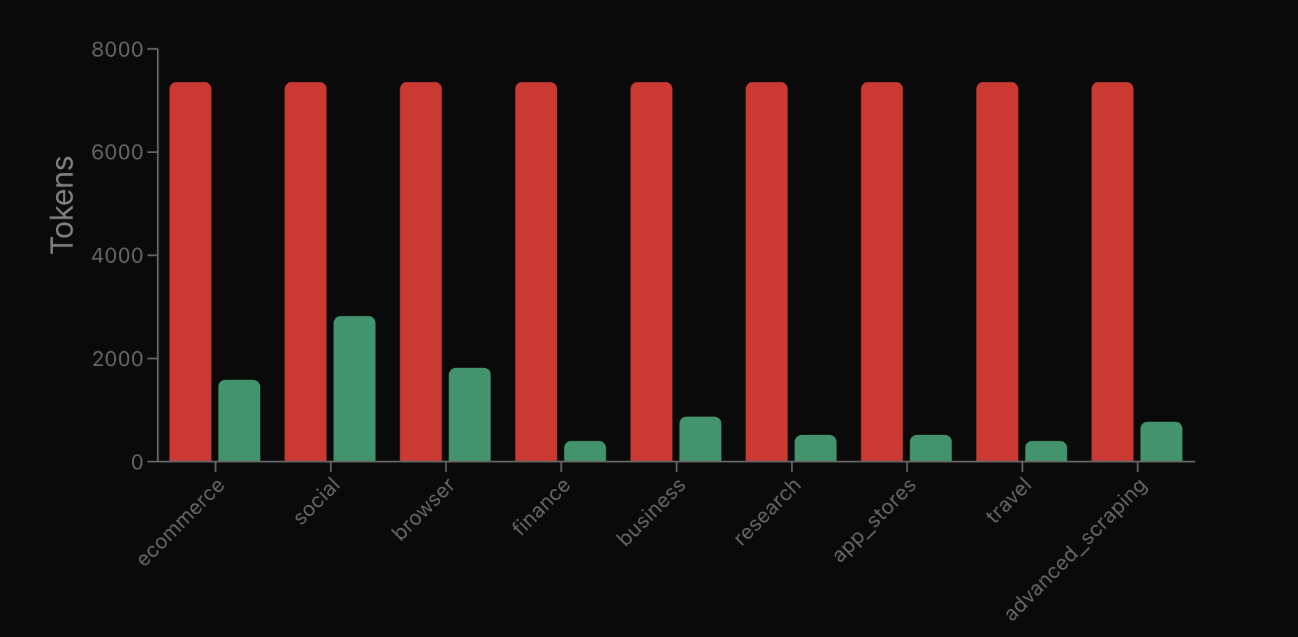 • Finance and Travel groups show the best optimization at 94.6% reduction (only 401 tokens vs 7,358)