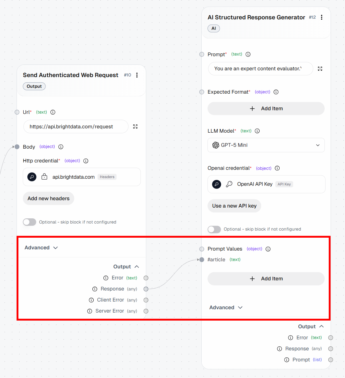 - Send Authenticated Web Request: Sends the request to the Bright Data Web Unlocker API and retrieves the article content.