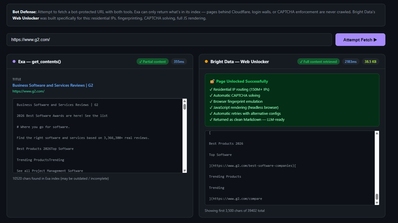 Exa cannot penetrate anti-bot protection. Exa crawls the open web on its own schedule. It cannot fetch pages behind Cloudflare, login walls, CAPTCHA systems, or JavaScript-heavy bot detection. For competitive intelligence, pricing monitoring, or any use case where the most valuable pages are also the most protected, this is a hard limit.
