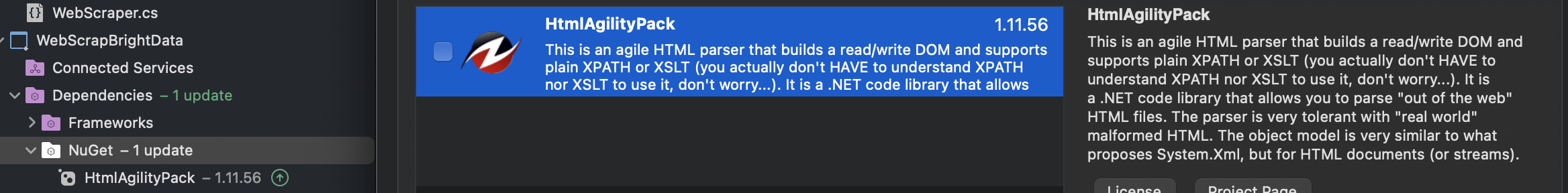 In both projects (ie WebScrapApp and WebScrapBrightData), add the NuGet package HtmlAgilityPack by right-clicking on the NuGet folder and then Manage NuGet Packages. When a pop-up window appears, search for “HtmlAgilityPack” and install it for both projects: