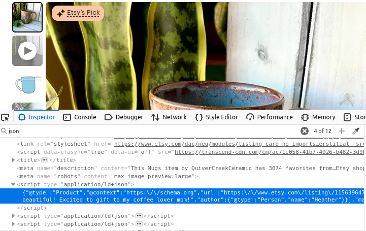 If you inspect an Etsy page, you might get caught in a nasty web of nested elements. If you know where to look, this is easy enough to overcome. Etsy’s pages use JSON data to render the page in the browser. If you can find the JSON, you can find all the data they used to build the page… without having to dig too deeply through the HTML of the document.