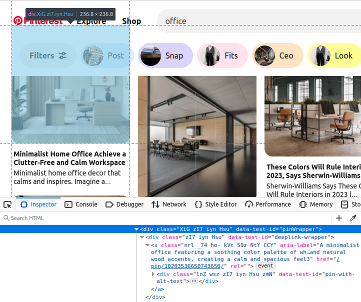 If you look at Pinterest in your browser, all of the pins are deeply nested inside a div element with data-test-id="pinWrapper".