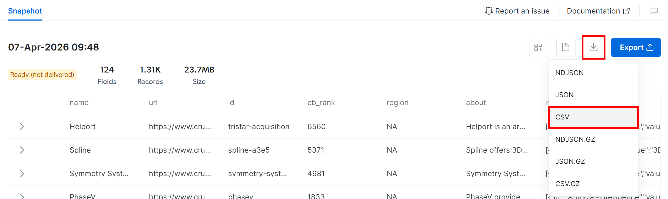 To retrieve the snapshot, click the “Download” icon and select the “CSV” option: