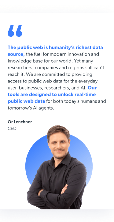 Our mission is to innovate as the ethical, responsible, and transparent leader of the web data infrastructure industry serving AI and & BI, while shaping the future of public data accessibility.