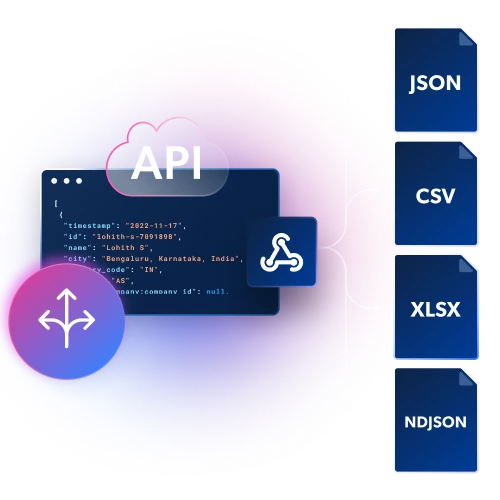Get structured data in JSON, NDJSON, or CSV files through Webhook or API delivery.